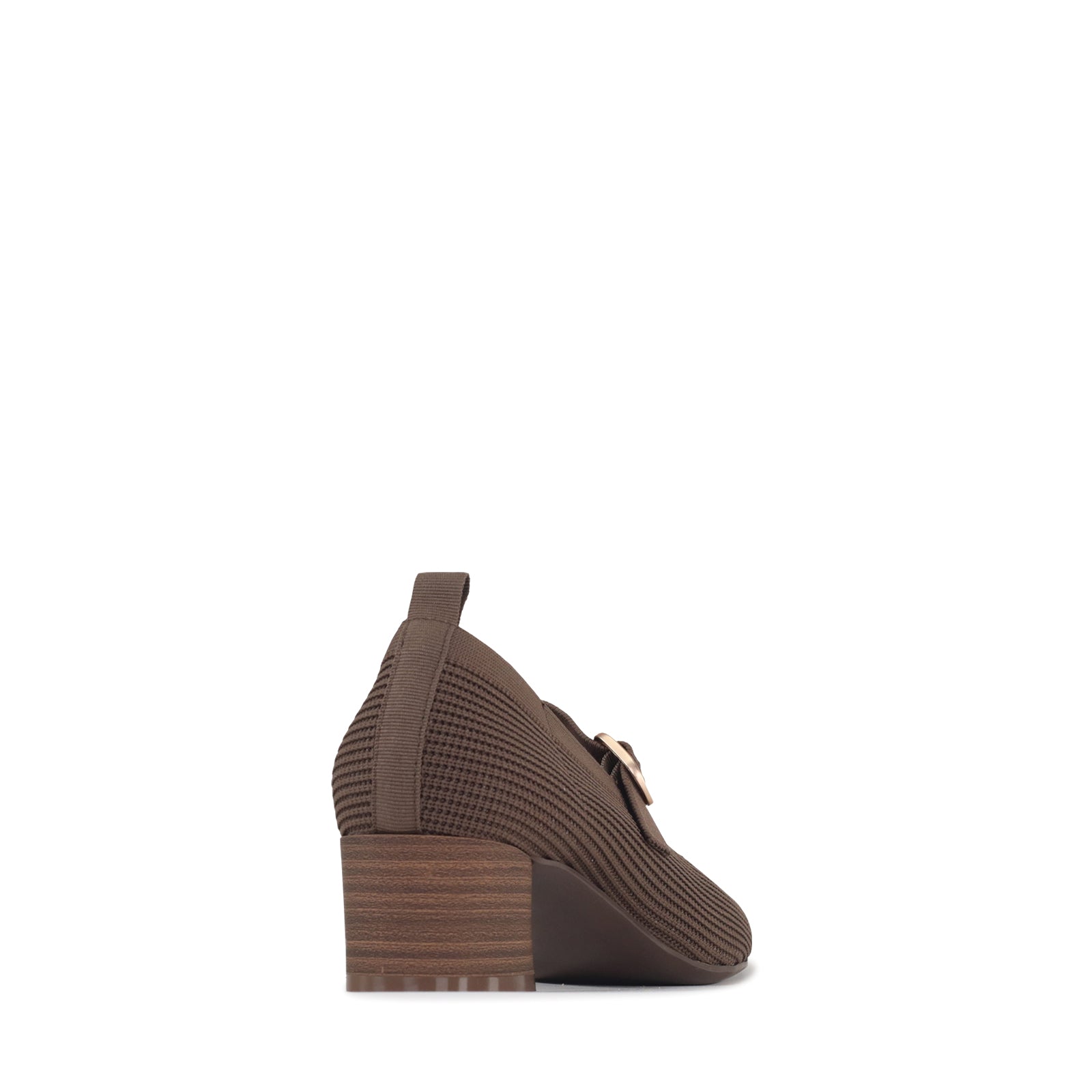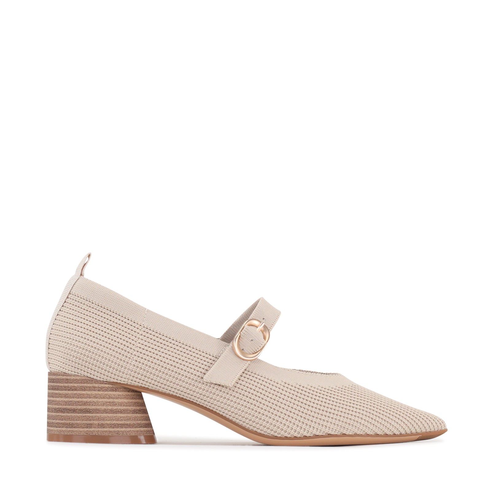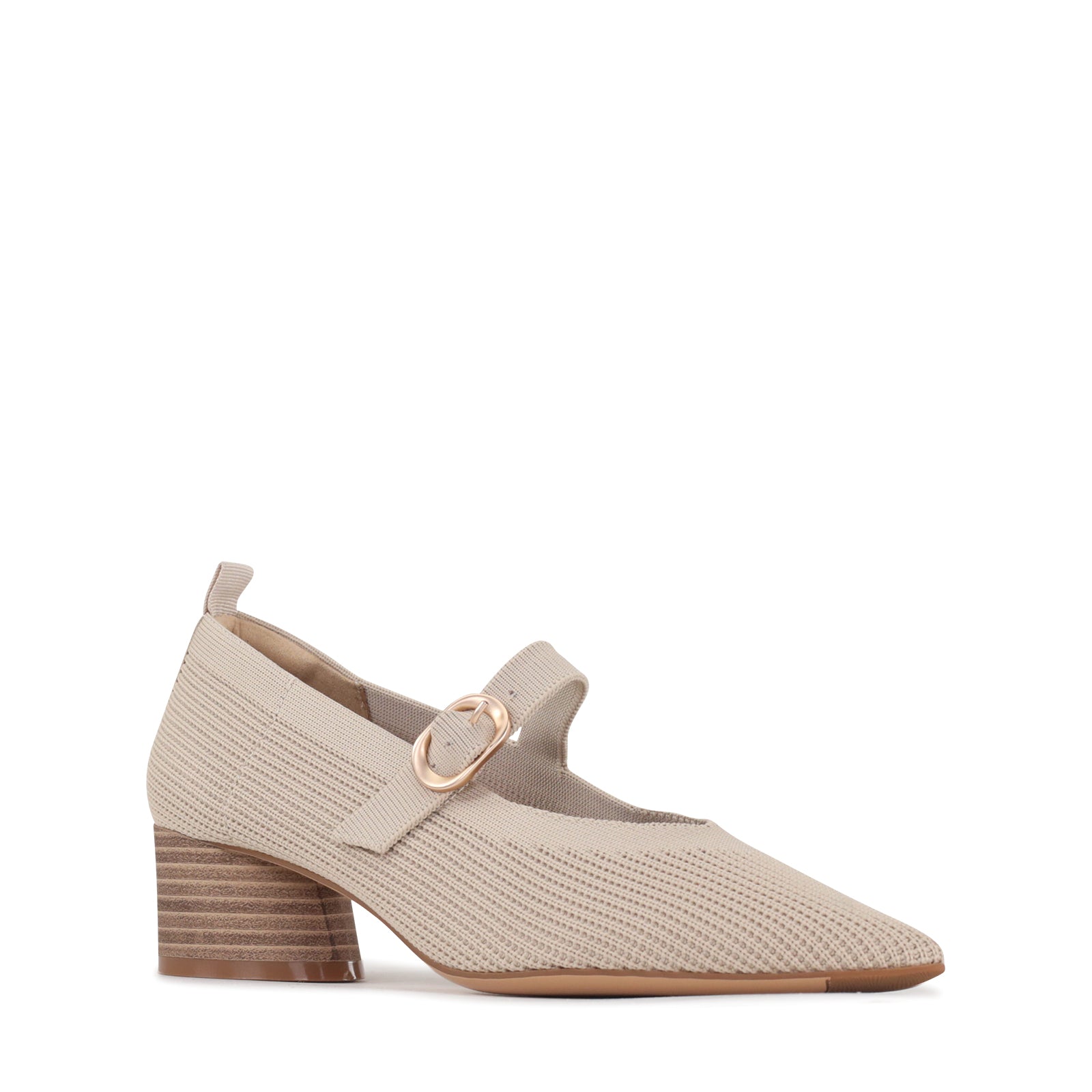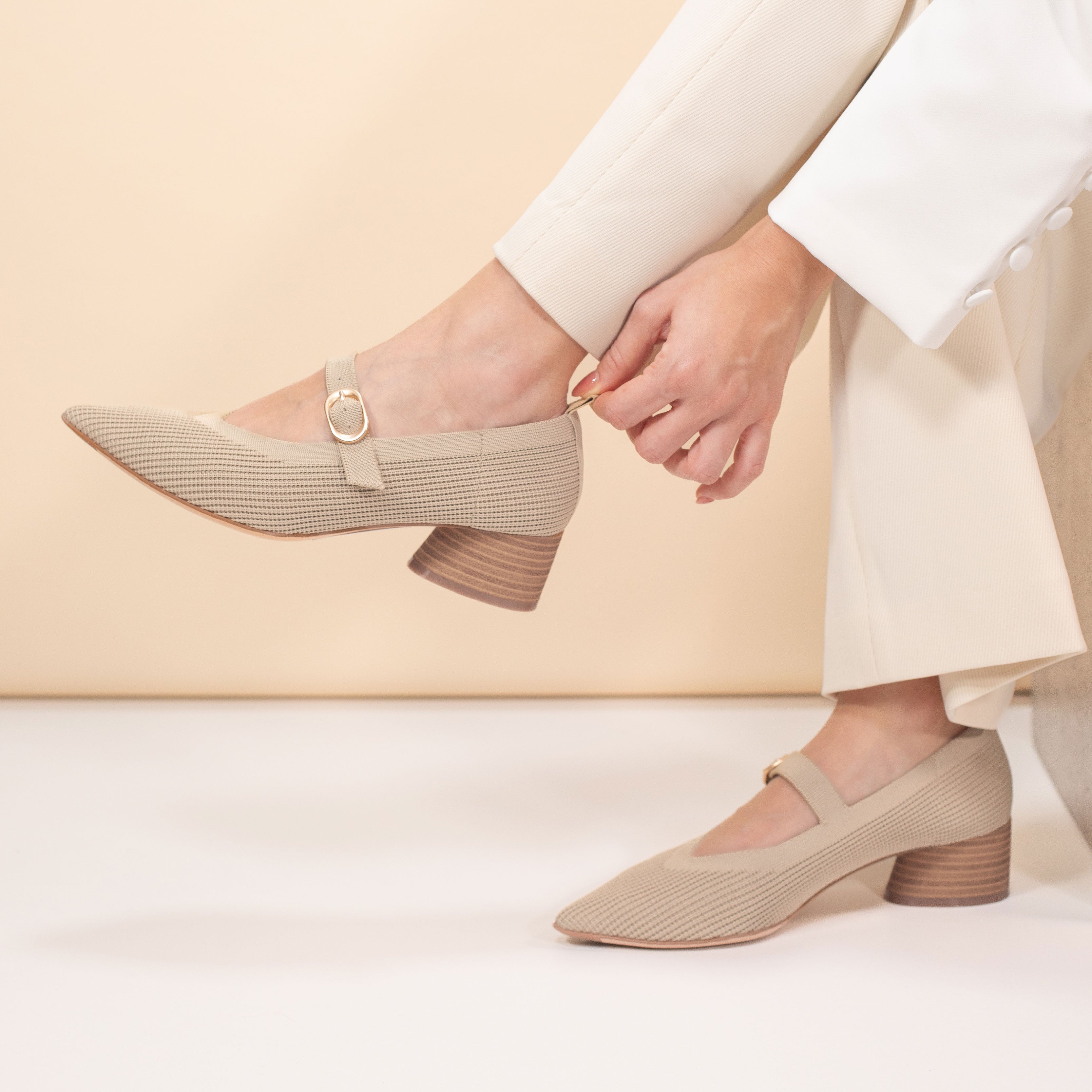A refined take on everyday elegance, this modern Mary Jane pump blends structure with softness for effortless wear. The textured flyknit upper moulds comfortably to the foot, creating a smooth, supportive fit, while the pointed toe sharpens the silhouette. A mid-height block heel offers balanced lift and stability, making it ideal for all-day use.