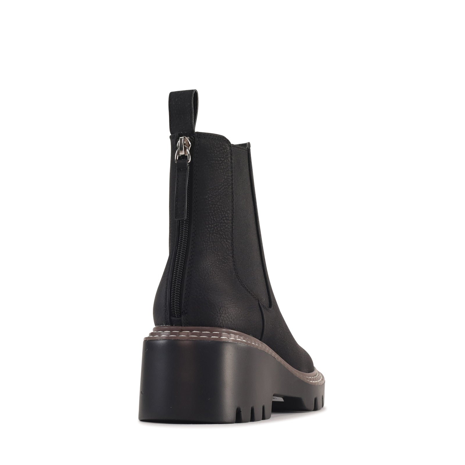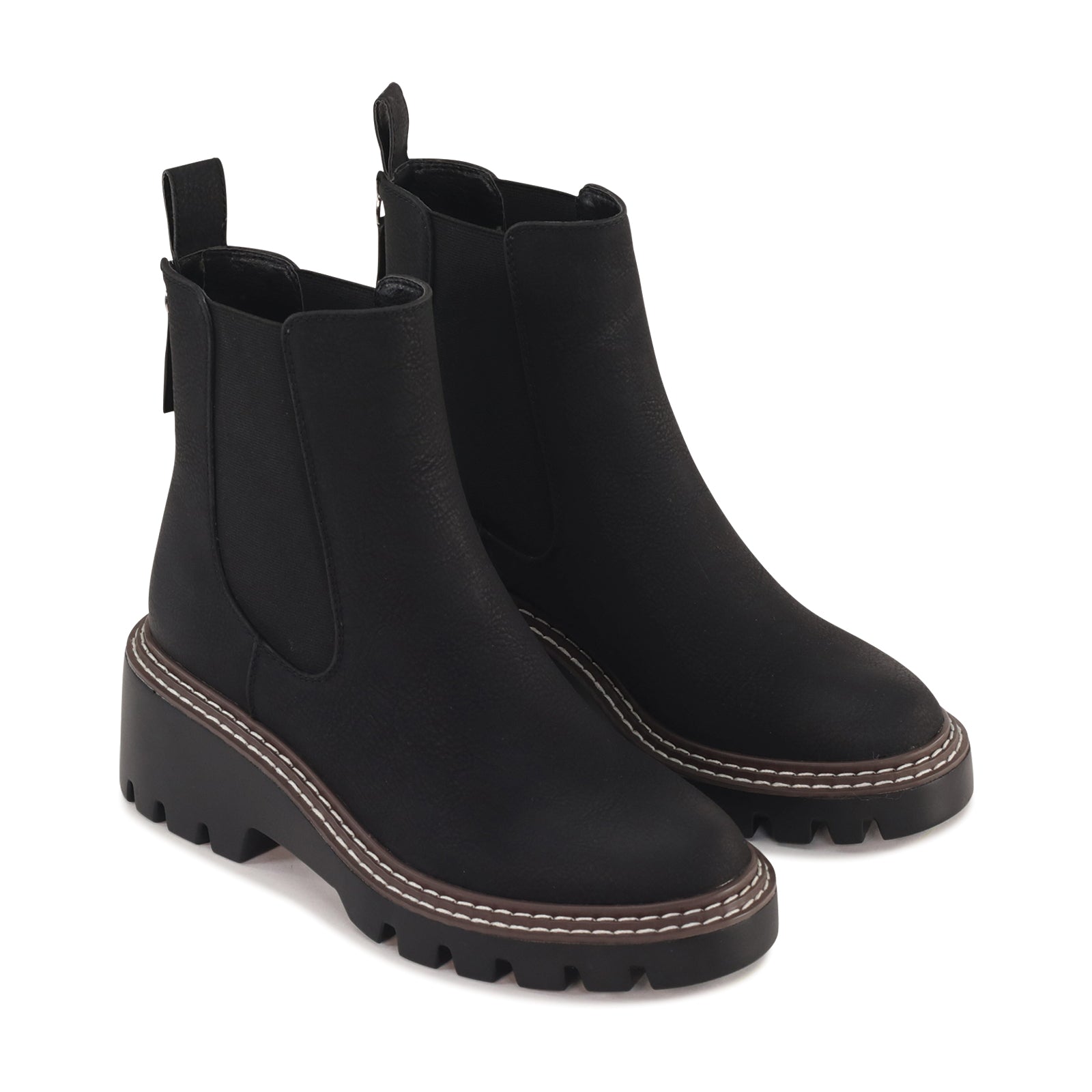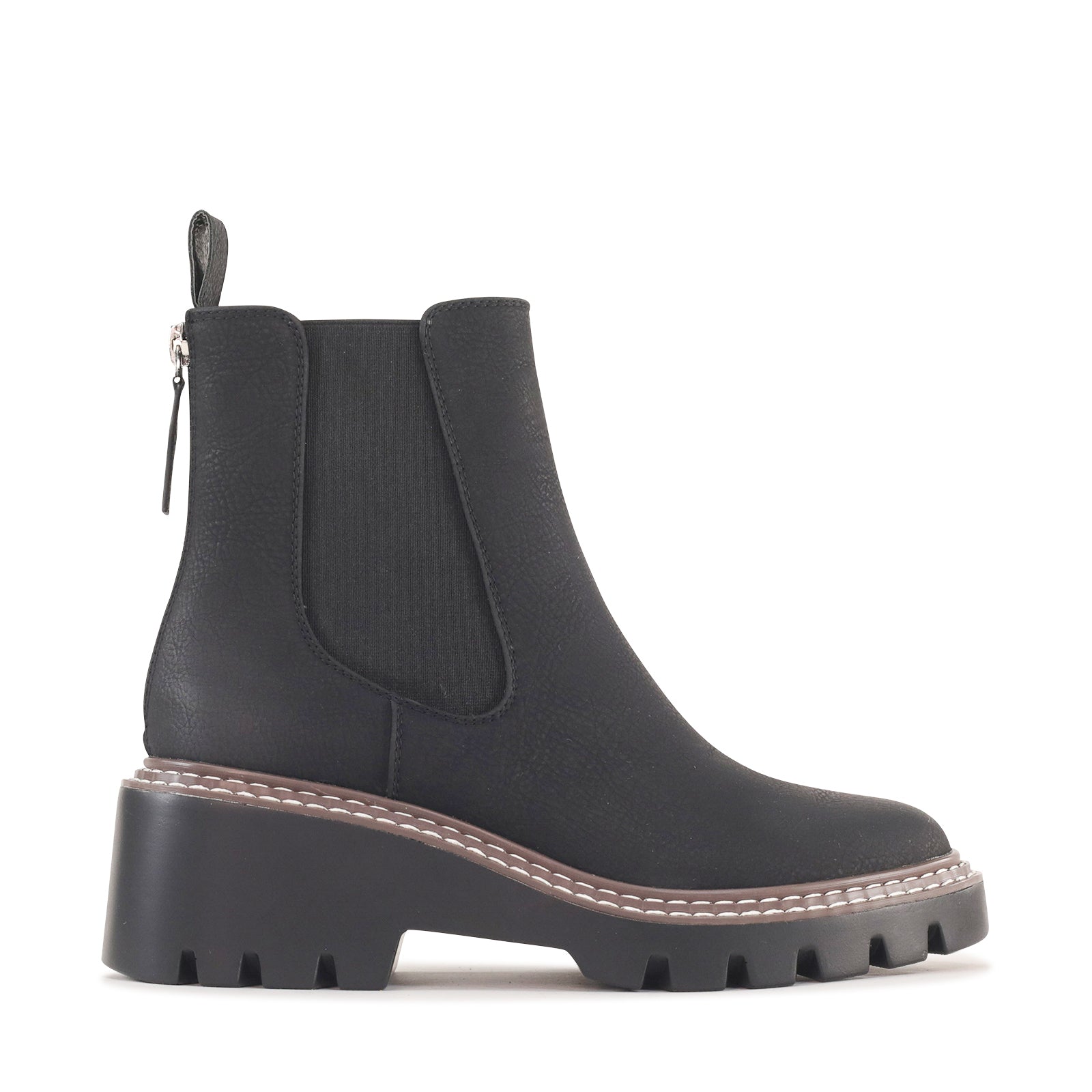 Viana is a modern ankle boot which combines classic Chelsea styling with a bold, contemporary edge. Crafted from manmade leather, it features elastic side panels for a comfortable, flexible fit and a back zip for easy on-and-off wear. The chunky lug sole and contrast stitching add a rugged touch while providing stability and traction, making it as practical as it is stylish. Finished with a rounded toe and elevated platform, this boot brings confident attitude to everyday looks.