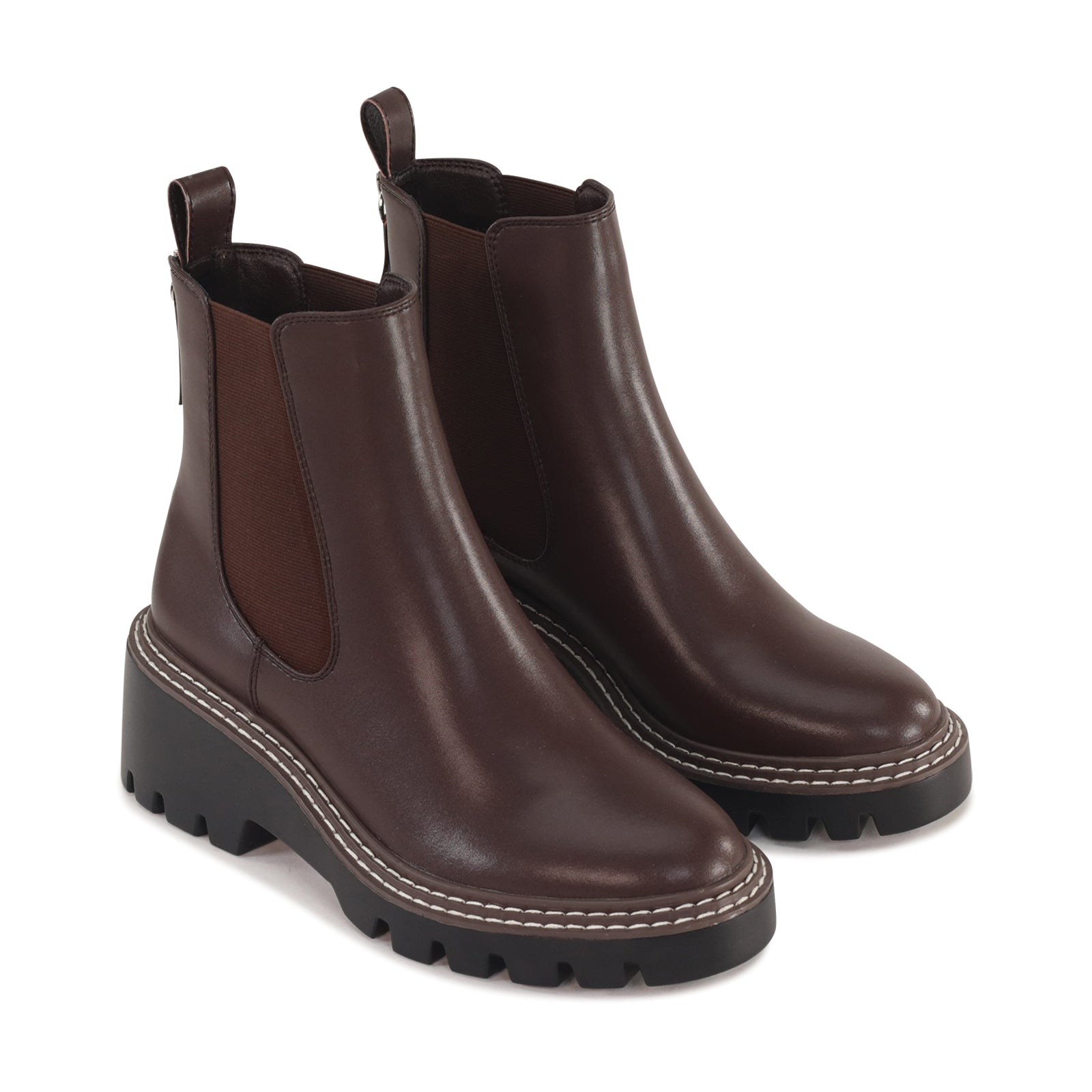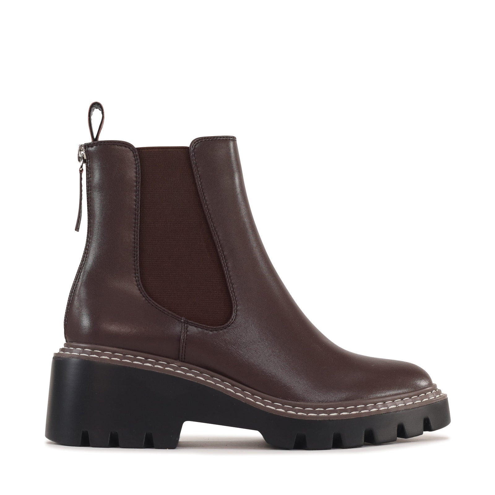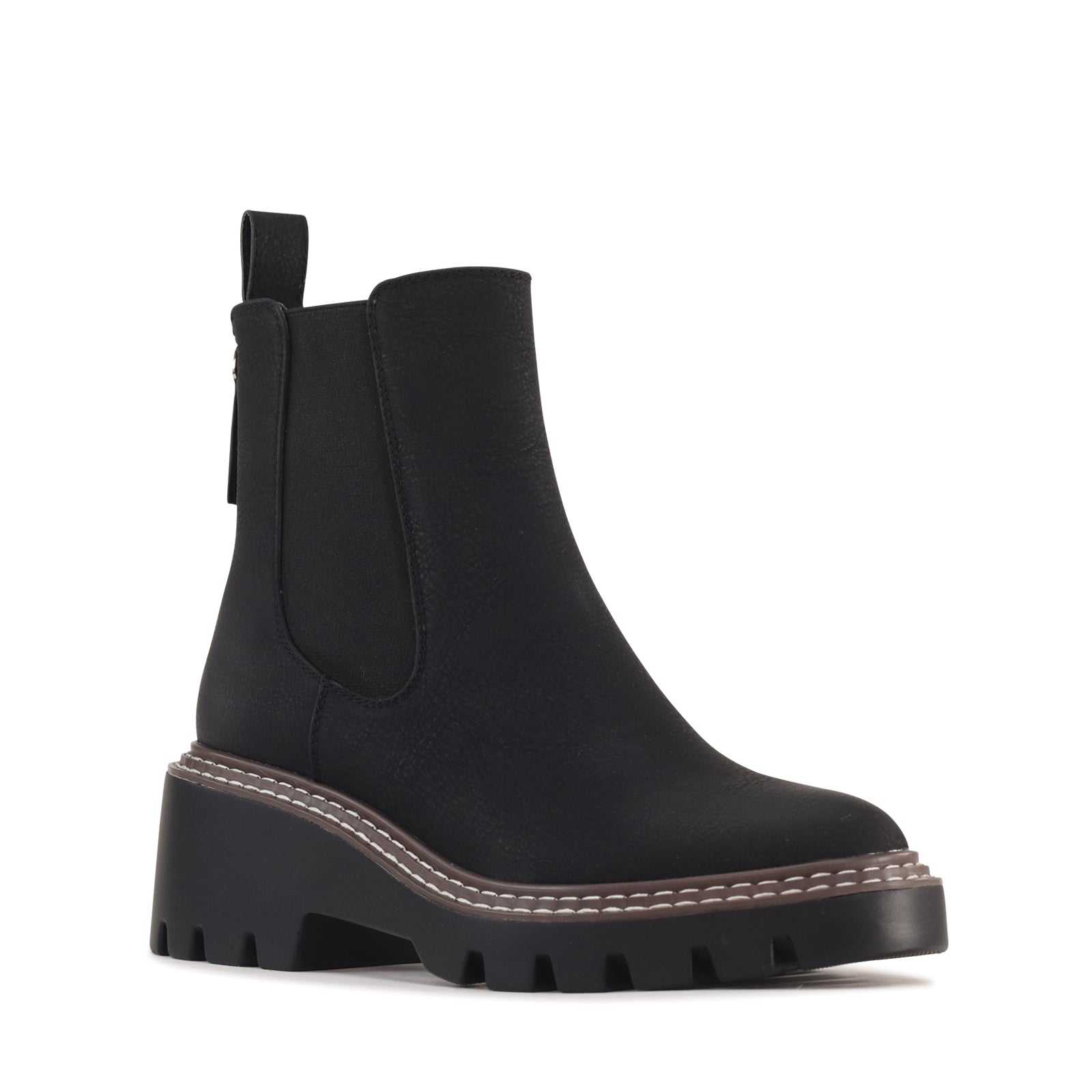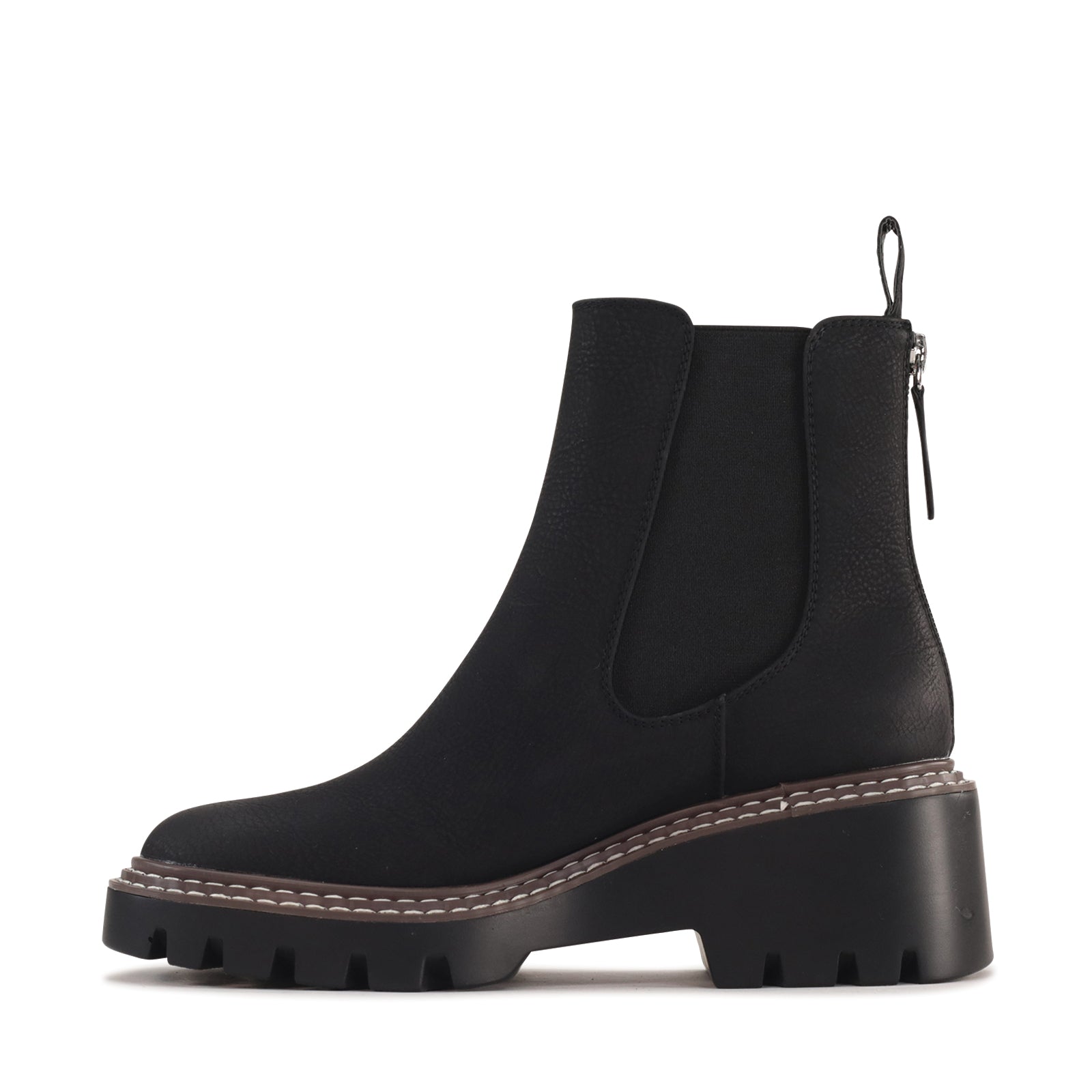 Viana is a modern ankle boot which combines classic Chelsea styling with a bold, contemporary edge. Crafted from manmade leather, it features elastic side panels for a comfortable, flexible fit and a back zip for easy on-and-off wear. The chunky lug sole and contrast stitching add a rugged touch while providing stability and traction, making it as practical as it is stylish. Finished with a rounded toe and elevated platform, this boot brings confident attitude to everyday looks.