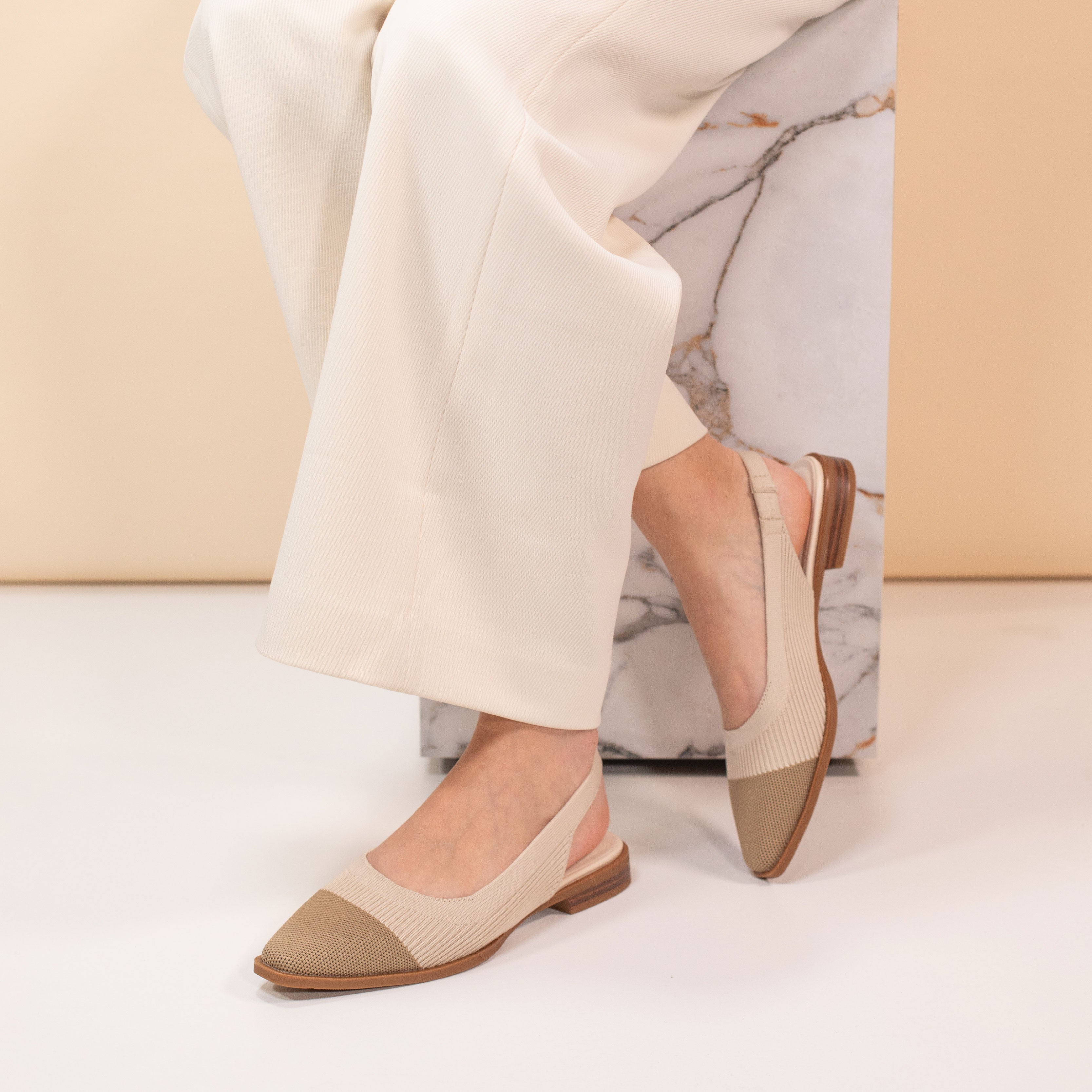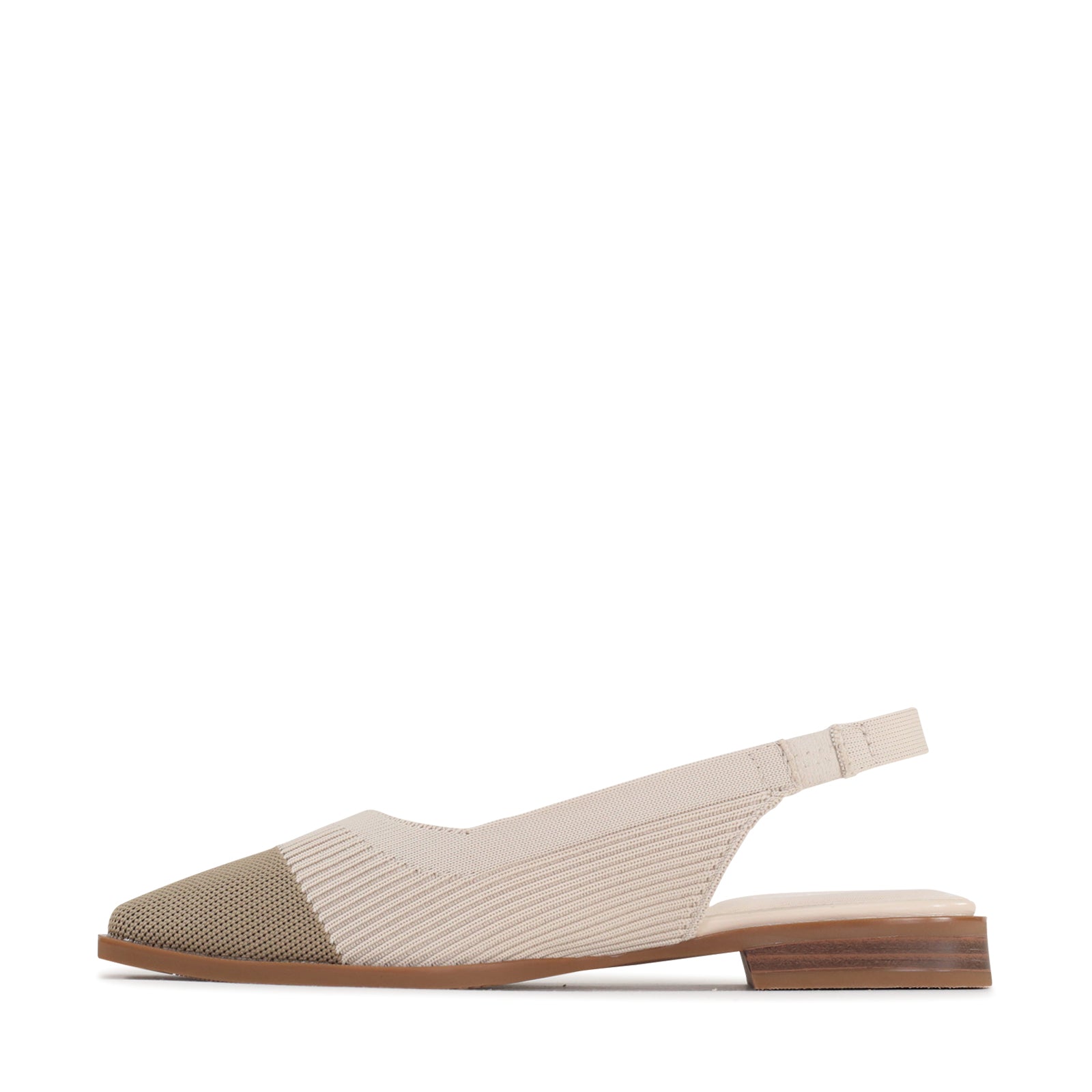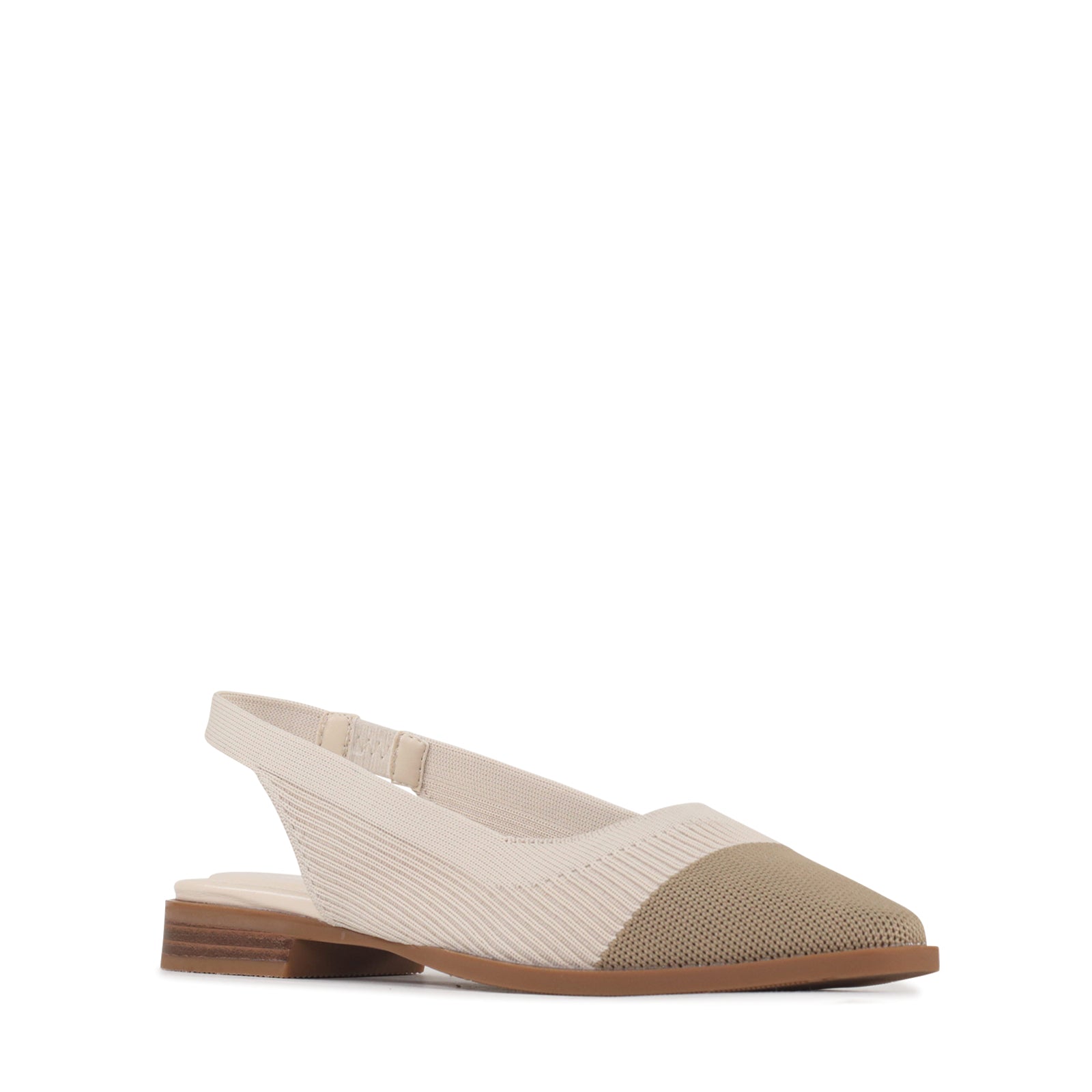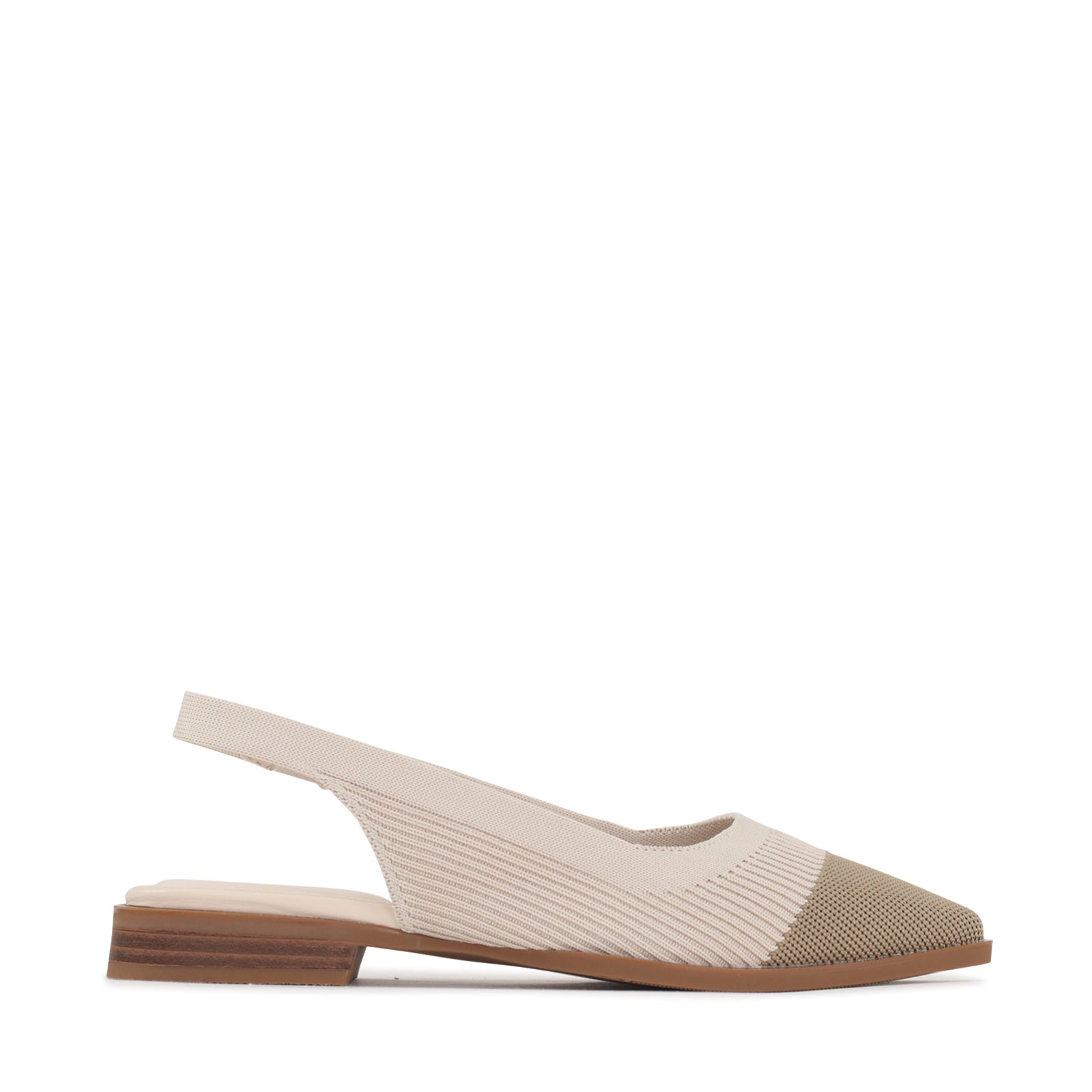 This modern slingback flat blends a clean silhouette with soft, breathable flyknit for all-day comfort. The textured woven upper gently hugs the foot, while the elastic slingback strap offers a flexible, secure fit. Finished with an almond-shaped toe and a low stacked heel, it delivers just the right amount of structure easy enough for everyday wear, refined enough for work or weekends out.