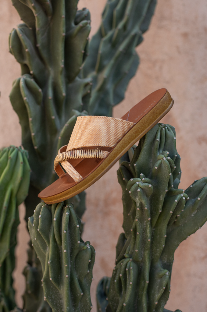 Earthy-chic slides with sun-kissed raffia-wrapped uppers and bamboo-textured accents, slipping on effortless resort style in a palette of sun-drenched hues, your timeless companion for every destination from Cabo coves to global getaways.