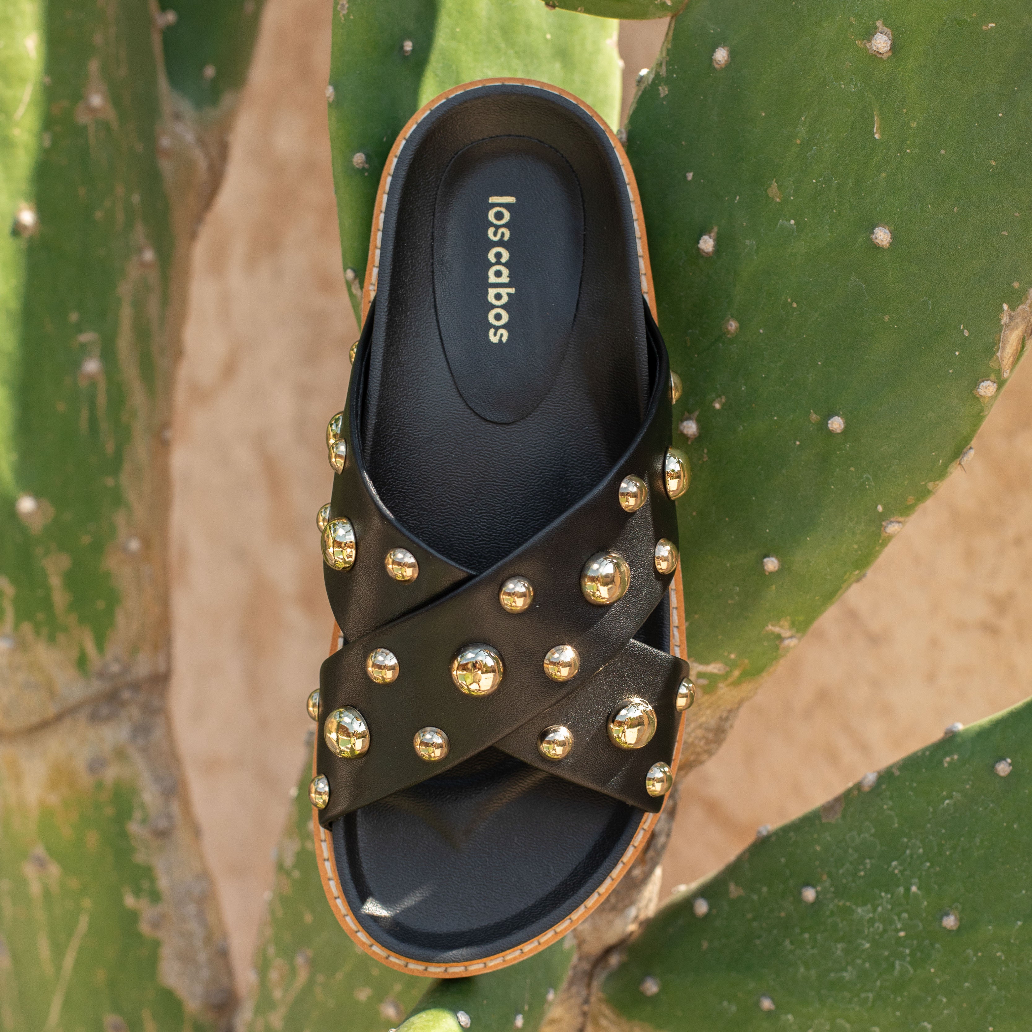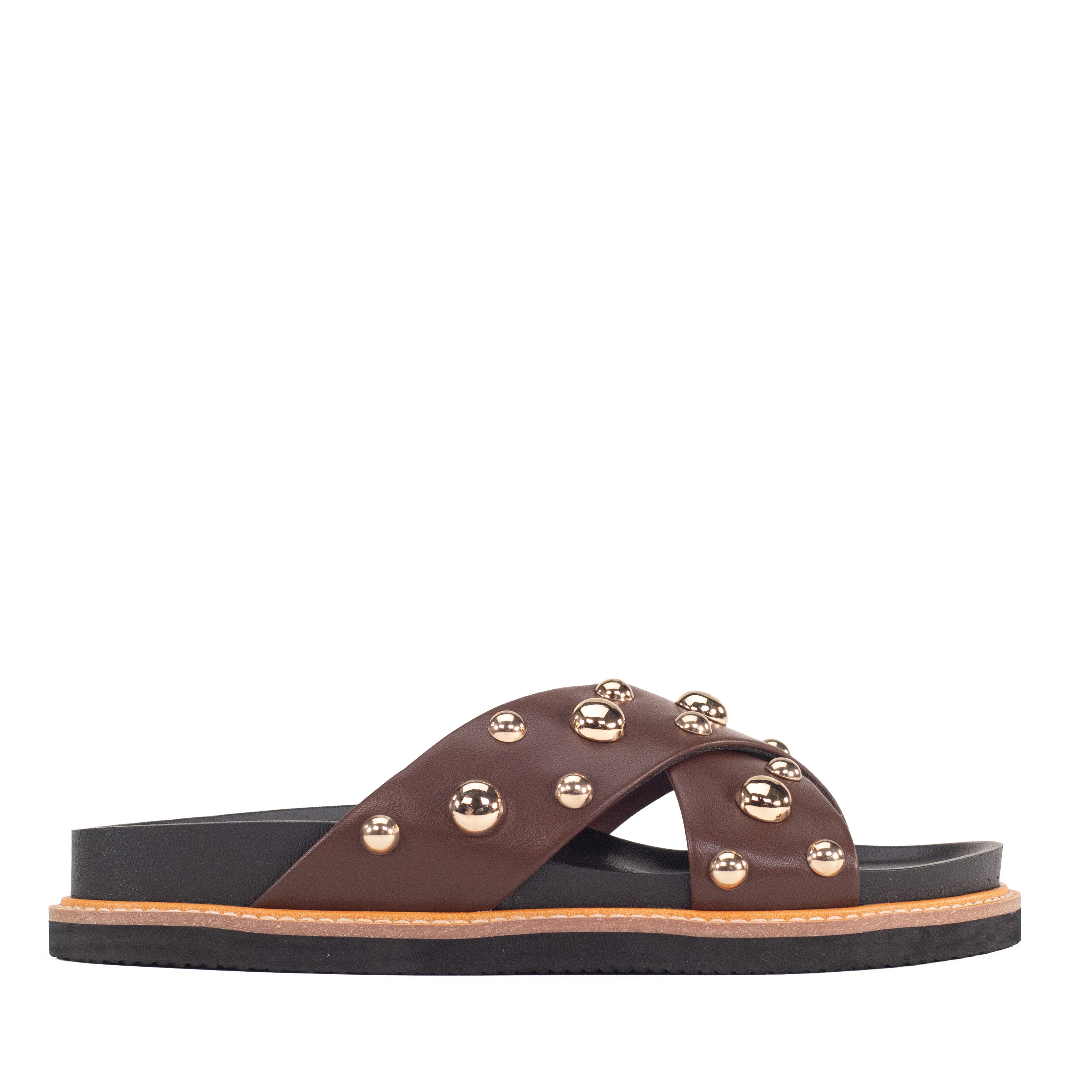 Mode is crafted with smooth manmade leather in a chic crisscross design, they’re finished with polished gold-tone studs for just the right amount of shine. The cushioned footbed offers all-day comfort, while the layered sole with contrast stitching adds durability and a refined touch. Easy to slip on and endlessly versatile, these sandals elevate everything from casual denim to summer dresses.
